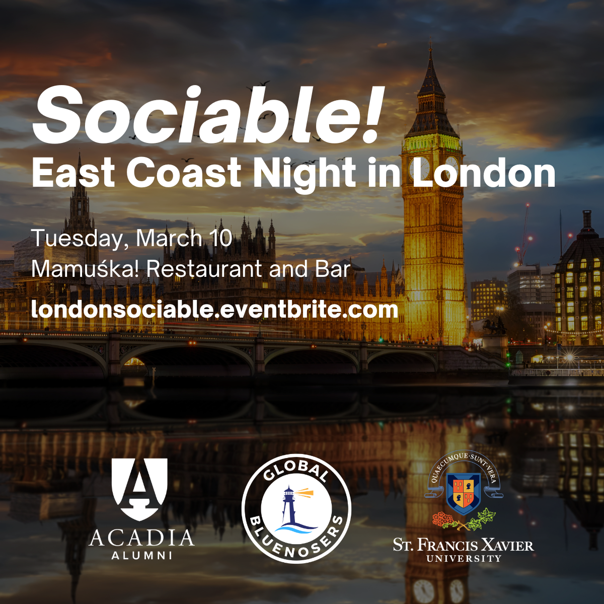 Acadia Alumni and Global Bluenosers invite Acadia alumni and friends living in London to gather for an evening rooted in East Coast connection, community, and shared experience.
