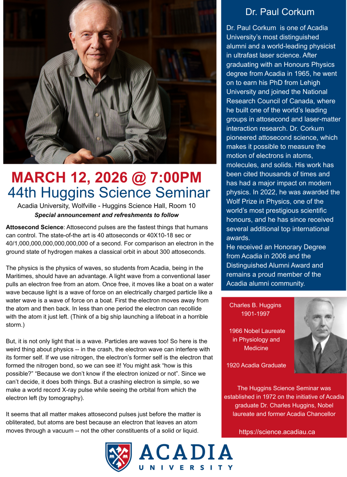 The Huggins Science Seminar was established in 1972 on the initiative of Acadia graduate Dr. Charles Huggins, Nobel laureate and former Acadia Chancellor.