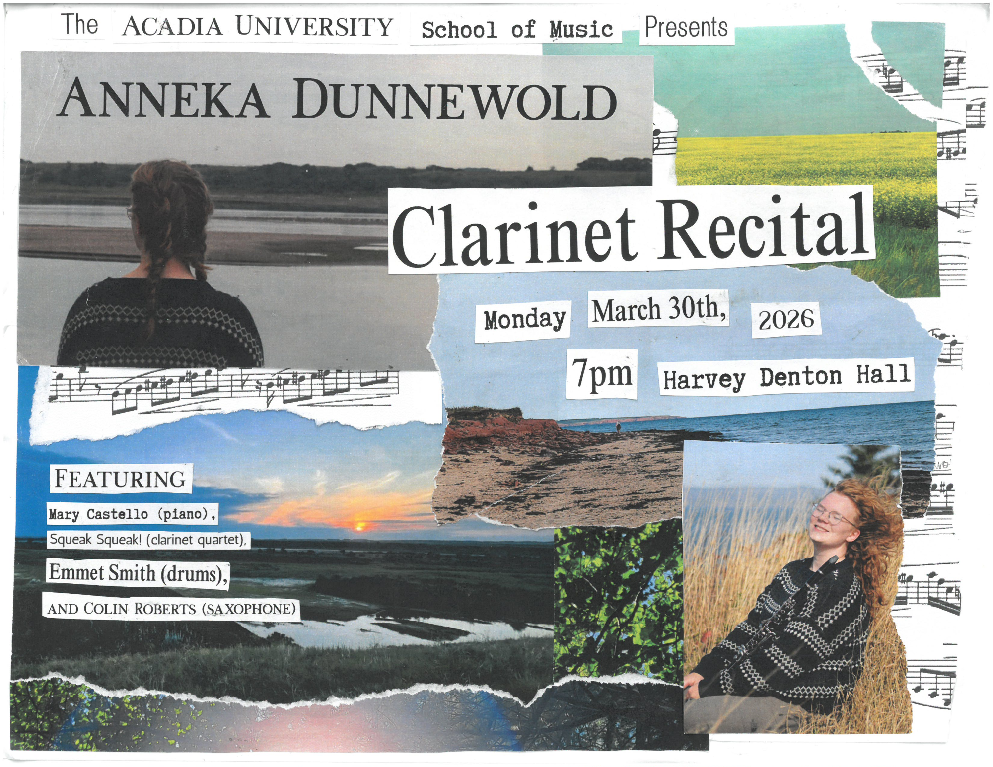 Acadia School of Music presents an exciting evening of high-level performance by clarinetist Anneka Dunnewold. To celebrate her upcoming graduation, Anneka will perform some of the most captivating works for clarinet, including compositions by Baker, Rabaud, Price, McCartney, and more! Anneka is joined by an excellent team of collaborators: Mary Castello (piano), Squeak Squeak! (clarinet quartet), Emmet Smith (drums) and Colin Roberts (saxophone). This recital is presented in partial fulfillment of MUSI 4943.