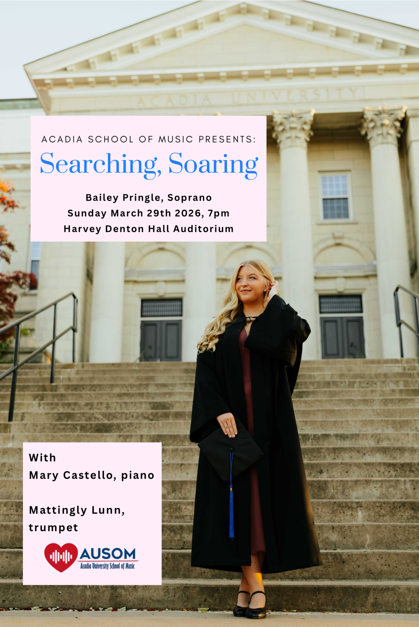On Sunday, March 29, 2026, Acadia University School of Music presents, "Searching, Soaring". A 60-minute recital. The program will feature Bailey Pringle (voice) accompanied by AUSOM collaborative pianist, Mary Castello, and Mattingly Lunn (trumpet).