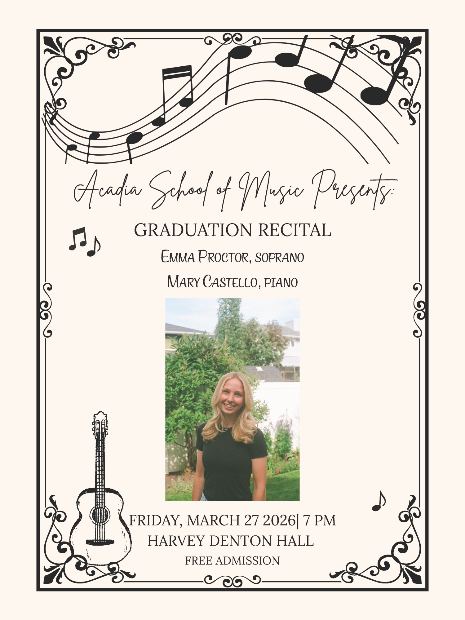 On Friday, March 27, 2026, Acadia University School of Music presents a 60-minute recital. The program will feature Emma Proctor (soprano) accompanied by AUSOM collaborative pianist, Mary Castello. This event will take place in Harvey Denton Hall Auditorium at 7:00pm and is free for all to attend, so please join us in supporting our AUSOM student performers!
