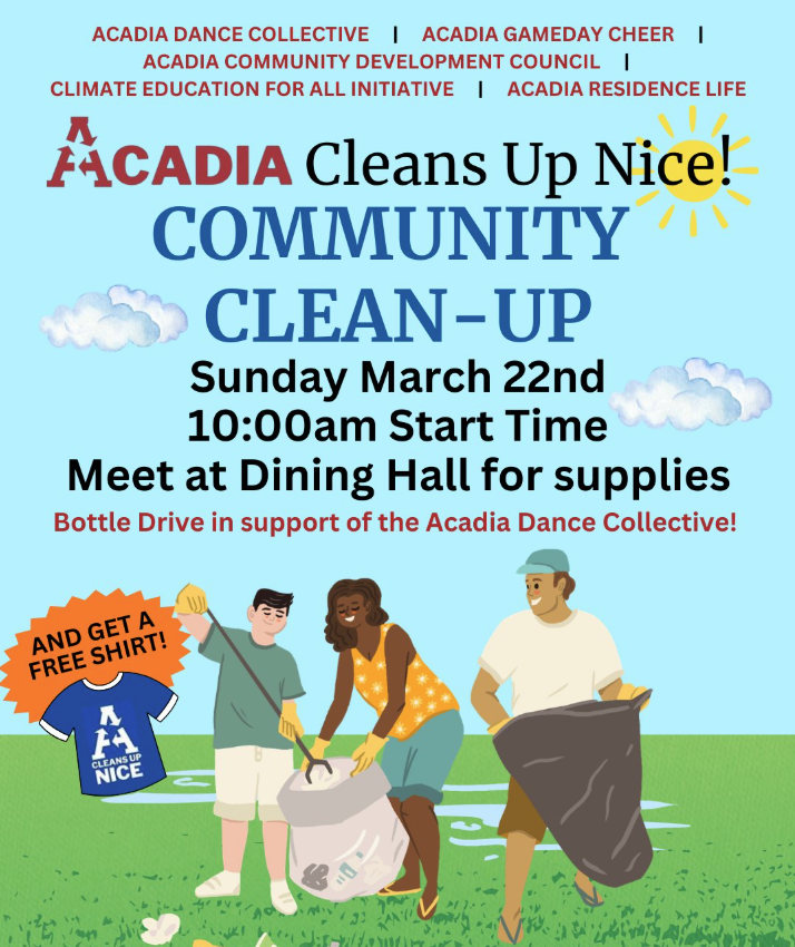 Meet at the Dining Hall to grab your supplies and take home a super cool shirt, helping make our community shine. Plus — we are donating collected bottles/cans in support of the Acadia Dance Collective💃🕺
