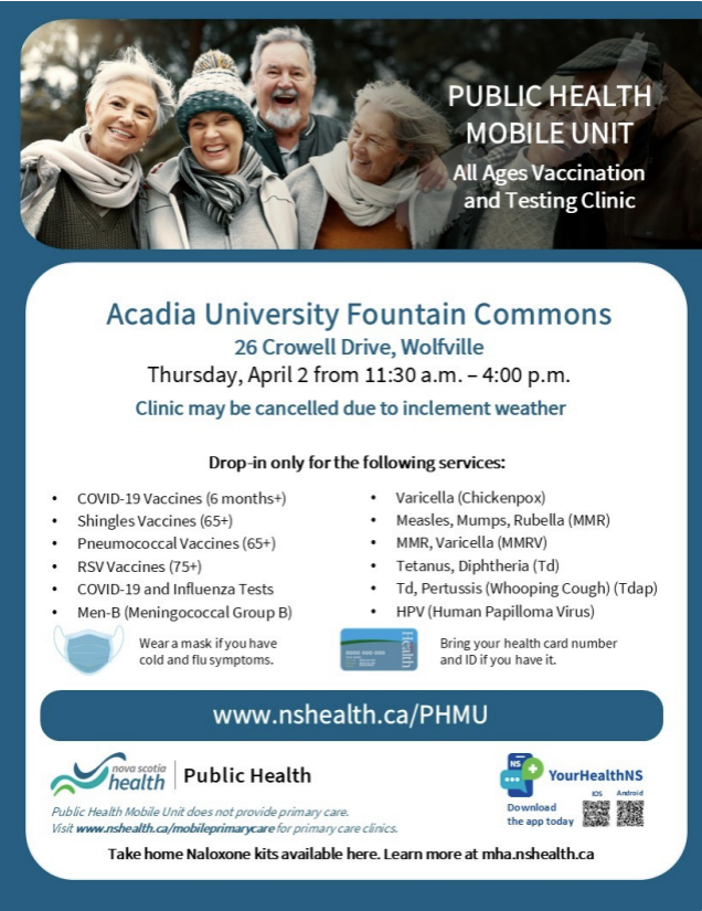 A Nova Scotia Public Health Mobile Unit will be on campus on April 2 for an all-ages vaccination and testing clinic.