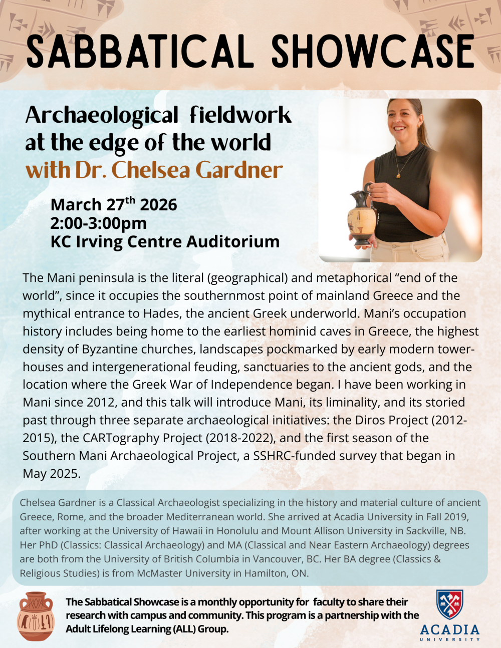 Abstract: The Mani peninsula is the literal (geographical) and metaphorical “end of the world”, since it occupies the southernmost point of mainland Greece and the mythical entrance to Hades, the ancient Greek underworld. Mani’s occupation history includes being home to the earliest hominid caves in Greece, the highest density of Byzantine churches, landscapes pockmarked by early modern tower-houses and intergenerational feuding, sanctuaries to the ancient gods, and the location where the Greek War of Independence began. I have been working in Mani since 2012, and this talk will introduce Mani, its liminality, and its storied past through three separate archaeological initiatives: the Diros Project (2012-2015), the CARTography Project (2018-2022), and the first season of the Southern Mani Archaeological Project, a SSHRC-funded survey that began in May 2025.