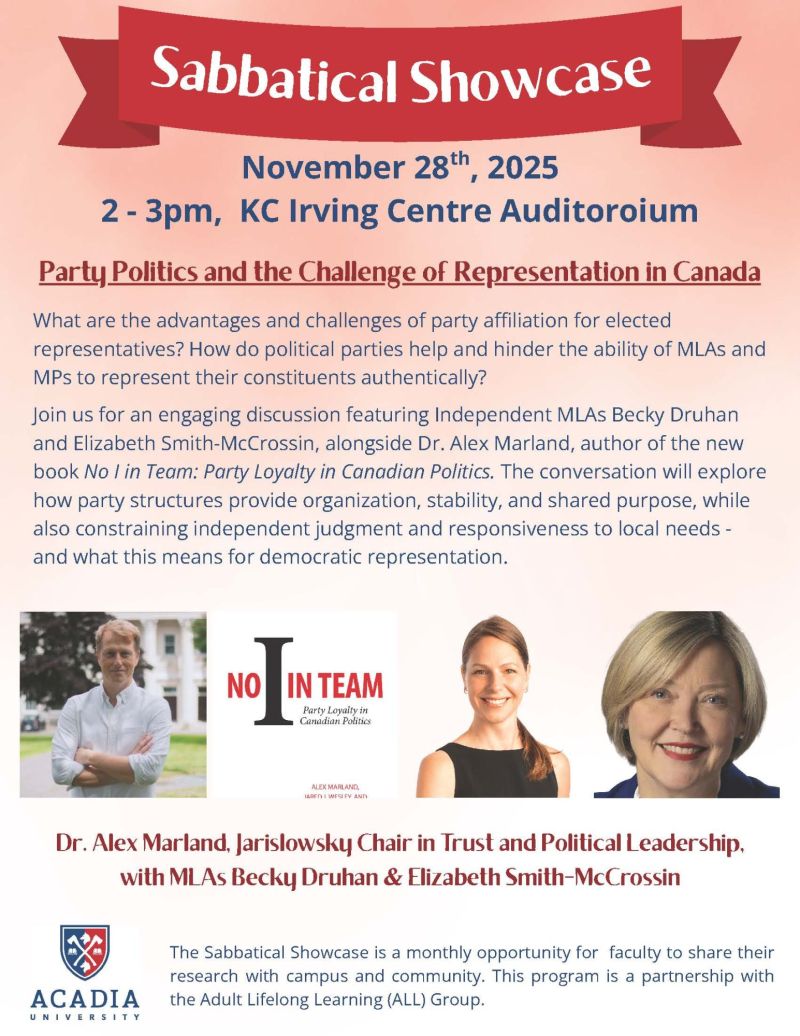 Join us for an engaging discussion featuring Independent MLAs Becky Druhan and Elizabeth Smith-McCrossin, alongside Dr. Alex Marland, author of the new book No I in Team: Party Loyalty in Canadian Politics. The conversation will explore how party structures provide organization, stability, and shared purpose, while also constraining independent judgment and responsiveness to local needs and what this means for democratic representation.