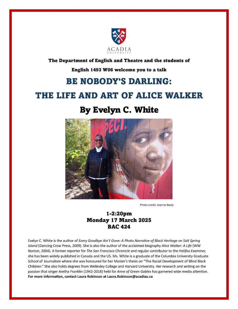 Evelyn C. White is the author of Every Goodbye Ain’t Gone: A Photo Narrative of Black Heritage on Salt Spring Island (Dancing Crow Press, 2009). She is also the author of the acclaimed biography Alice Walker: A Life (WW Norton, 2004). A former reporter for The San Francisco Chronicle and regular contributor to the Halifax Examiner, she has been widely published in Canada and the US. Ms. White will be giving a talk, open to the Acadia community and the public, on Alice Walker.