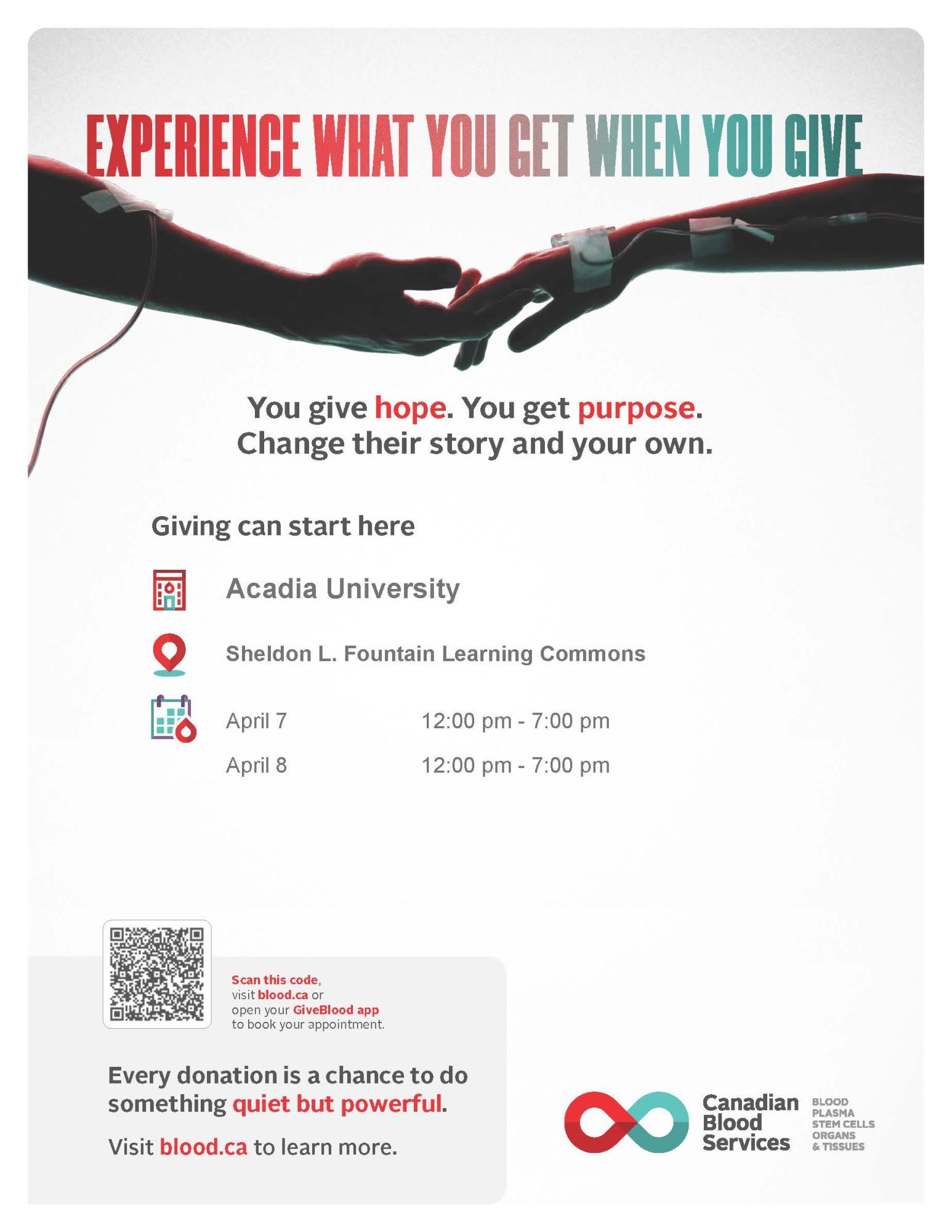 Canadian Blood Services will be on site in Fountain Commons on April 7th and 8th from 12-7pm both days. You can book an appointment online at blood.ca or via the GiveBlood app