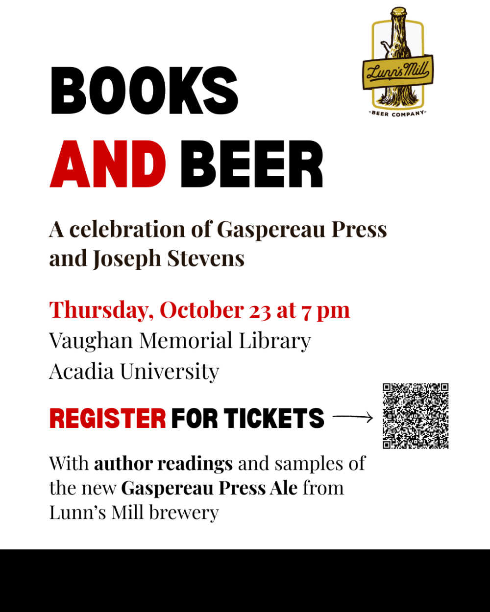 We hope you can join us on Thursday, October 23 at 7 pm at the Vaughan Memorial Library, Acadia University, for a celebration of Gaspereau Press, including readings from award-winning authors.