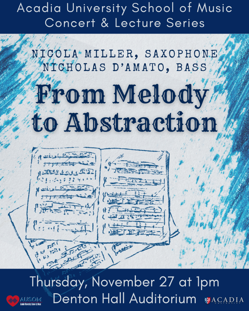 On Thursday, November 27, the Acadia School of Music’s Concert & Lecture Series presents “From Melody to Abstraction” by saxophonist Nicola Miller and bassist Nicholas D’Amato.