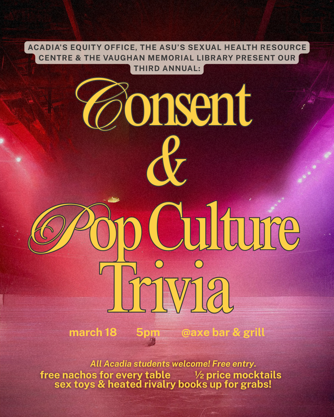 Join Acadia Equity, the ASU's Sexual Health Resource Centre, and the Vaughan Memorial Library for our third annual Consent & Pop Culture Trivia night at the Axe! We'll be talking consent, pleasure, and (of course), Heated Rivalry! Bring your friends for a chance to win toys from the SHRC, a copy of Heated Rivalry, or other fun goodies! Not to mention the FREE nachos for every table.