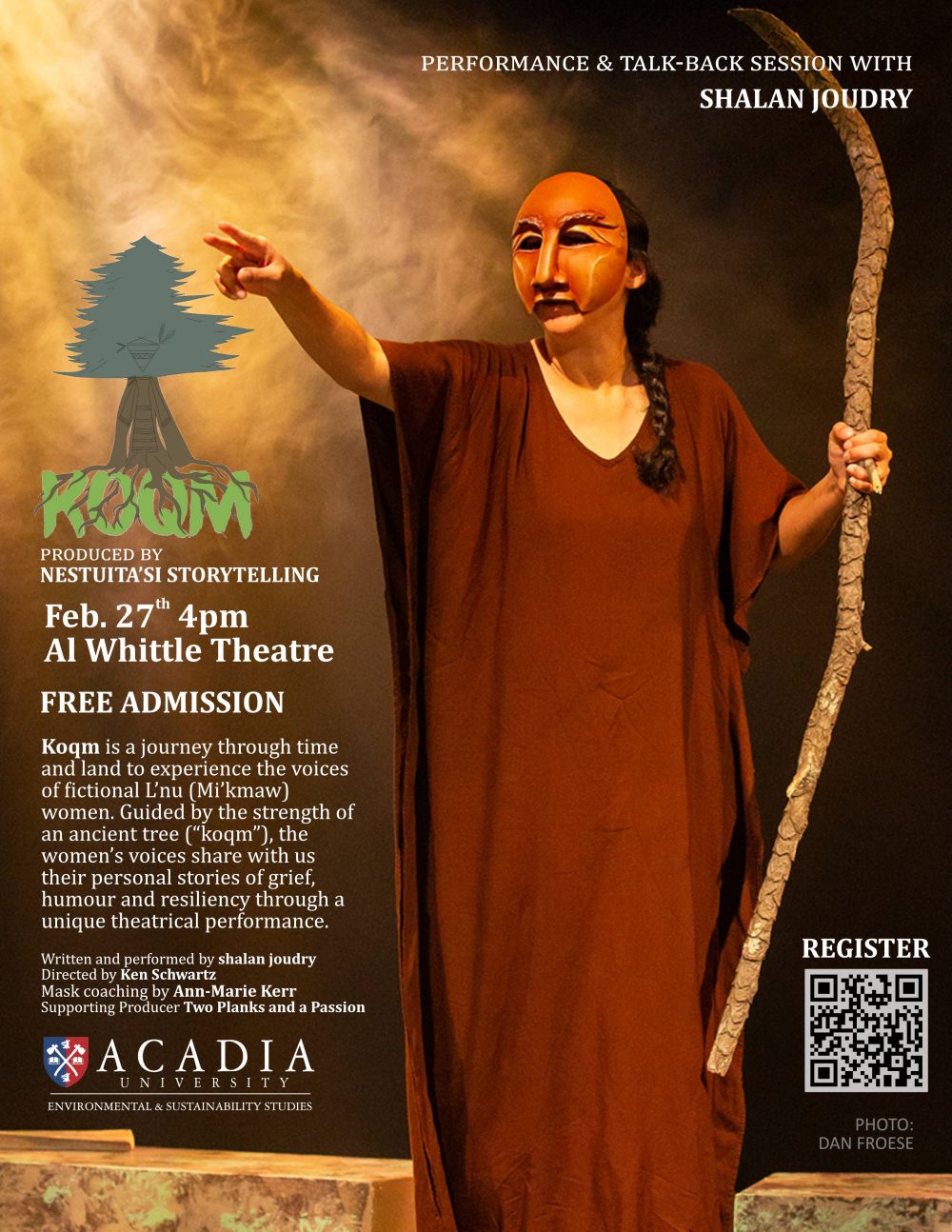 KOQM is a unique theatrical performance written and performed by shalan joudry and produced by Nestuita'si Storytelling. Koqm is a journey through time and land to experience the voices of fictional L'nu (Mi'kmaw) women. Guided by the strength of an ancient tree ("koqm"), the women's voices share with us their personal stories of grief, humour, and resiliency.