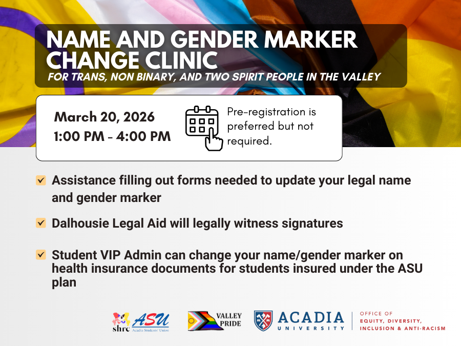 Valley Pride, Acadia Equity, the ASU's SHRC, and Dalhousie Legal Aid are working together to bring you a legal name change and gender marker change clinic! We encourage everyone to order a free ticket to ensure your spot, but we will also take walk-ins as time allows.