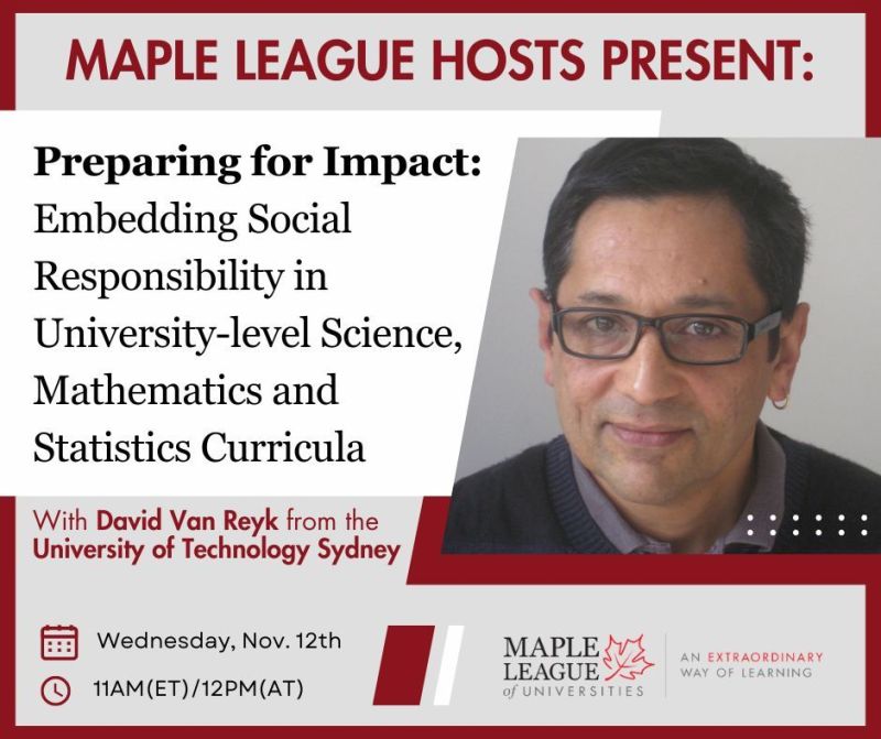 The Maple League Teaching and Learning Committee warmly invites you to our next Maple League Hosts event: Preparing for Impact: Embedding Social Responsibility in University-level Science, Mathematics and Statistics Curricula with David Van Reyk, University of Technology Sydney.
