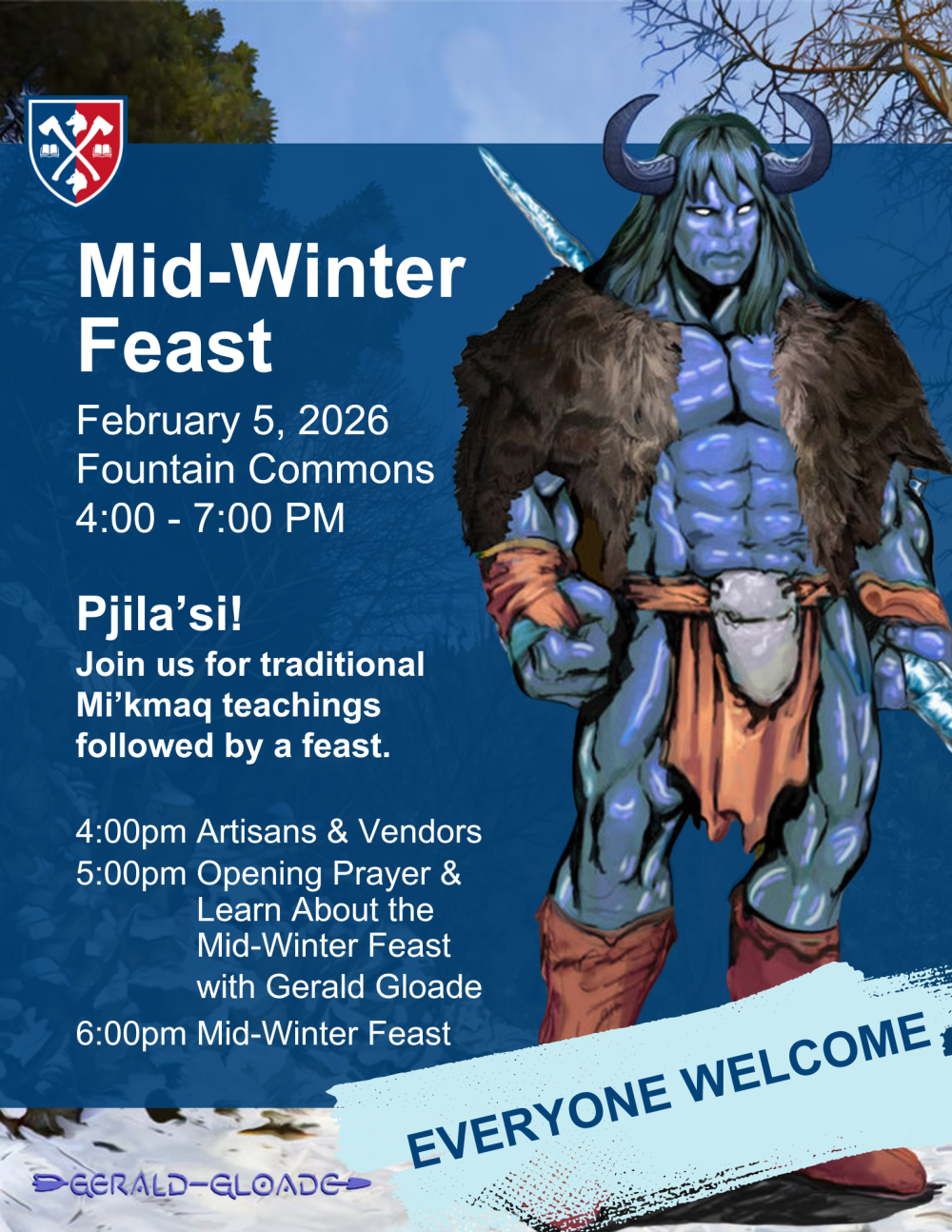 Join us on February 5, 2026, from 4:00–7:00 pm in Fountain Commons's Great Hall for Acadia’s Midwinter Feast, a Mi’kmaw tradition that marks the passing of the harshest part of winter and gives thanks for life, health, and community. Rooted in practices that long predate European contact—and revived after being banned under the Indian Act—the Midwinter Feast is a time to come together, share teachings, and enjoy a warm, nourishing meal.