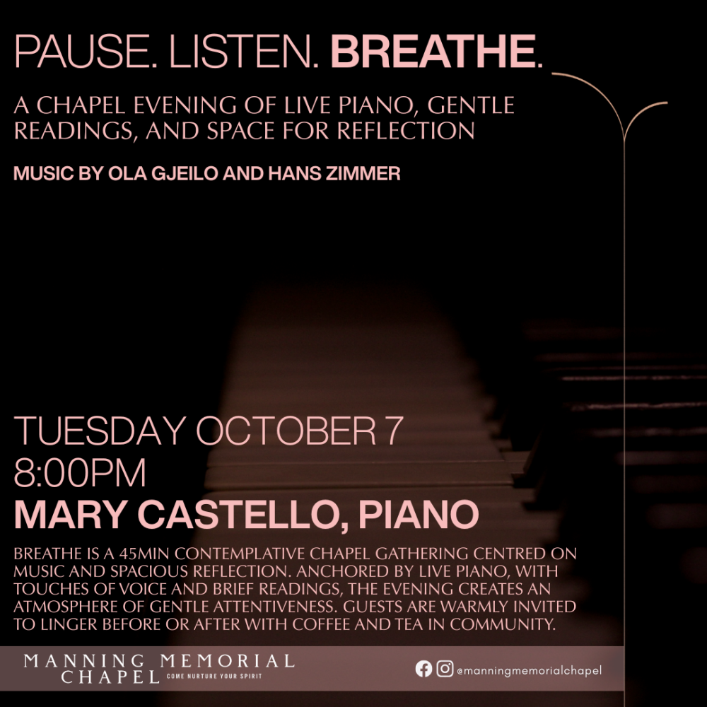 Breathe is a 45min contemplative chapel gathering centred on music and spacious reflection. Anchored by live piano, with touches of voice and brief readings, the evening creates an atmosphere of gentle attentiveness. Guests are warmly invited to linger before or after with coffee and tea in community.