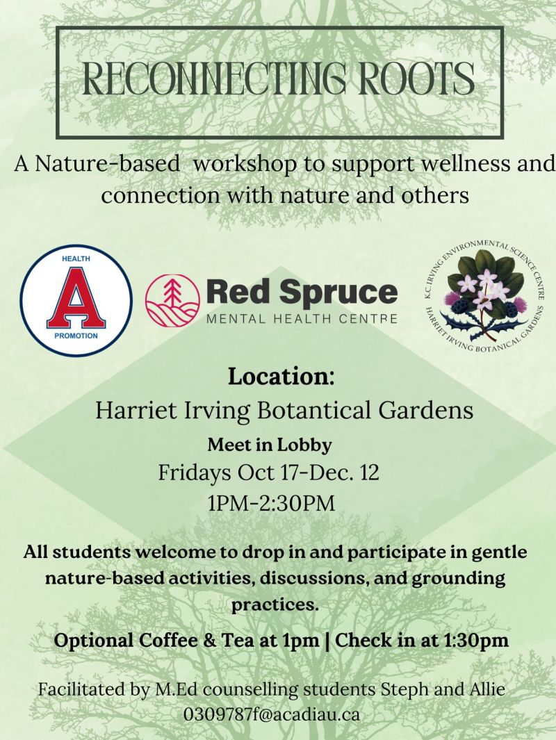 The Red Spruce Mental Health Centre is offering nature-based workshops in support of wellness and connection with nature and others weekly at the Harriet Irving Botanical Gardens this fall. Sessions facilitated by Acadia University Masters of Education Counselling Students Stephanie and Allie.