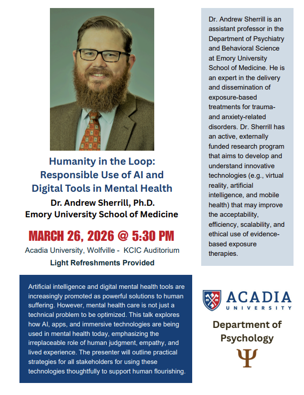 Dr. Andrew Sherrill, Assistant Professor in the Department of Psychology and Behavioral Science at Emory University School of Medicine, will be giving a talk on the responsible use of AI and other digital tools in the delivery of mental health care.
