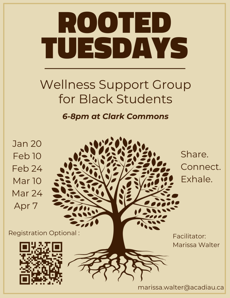 This drop-in support group offers Black students an opportunity to share and explore their thoughts, concerns, and experiences in a safe and liberating space. Discussions will focus on the multifaceted “Black student experience” at Acadia. Topics may include wellness, stigma, being “the only one,” culture, and community. The group format will allow for Black students from diverse identities, countries, cultures, programs, and levels of study to connect and experience a sense of community support. This is a drop-in group, meaning that once you've signed up, you can attend whenever you are able to make it.