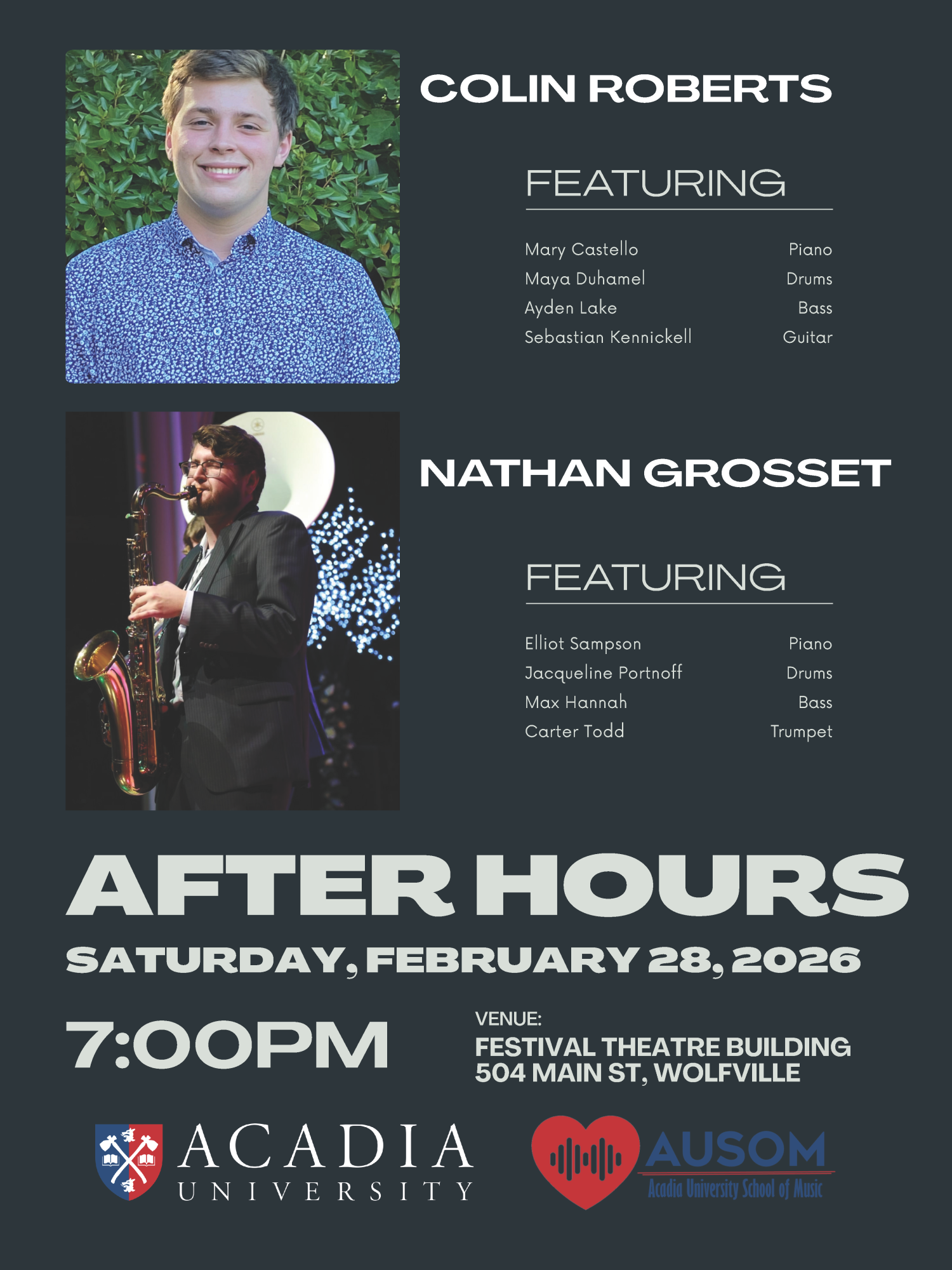 On Saturday, February 28, 2026 pm, Acadia University School of Music presents: After Hours, two 30-minute saxophone recitals featuring Colin Roberts (accompanied by Sebastian Kennickell on guitar, Maya Duhamel on drums, Ayden Lake on bass, and Mary Castello on piano), and Nathan Grosset (accompanied by Elliot Sampson on piano, Jacqueline Portnoff on drums, Max Hannah on bass, and Carter Todd on trumpet).