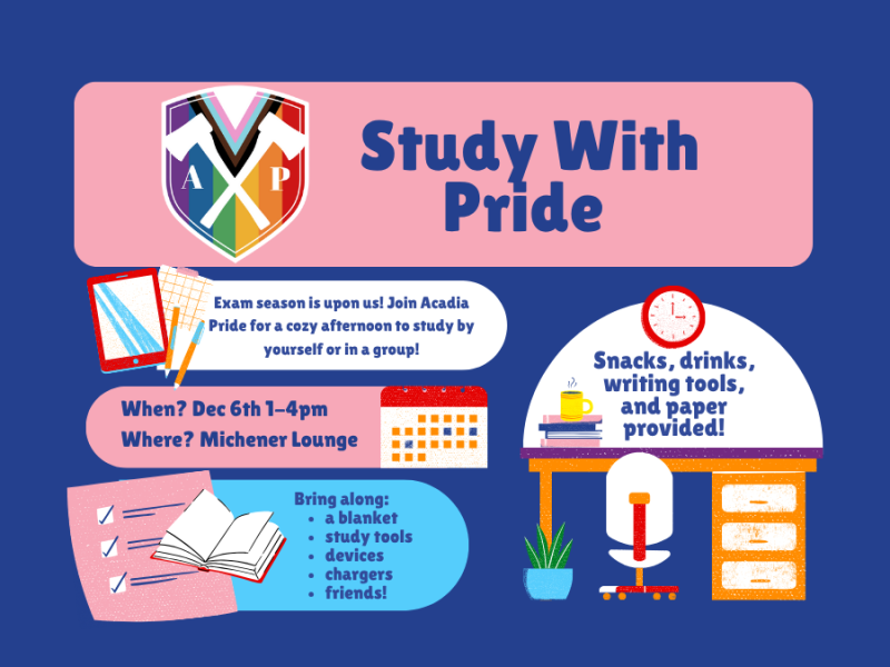 Exam season is upon us! Join Acadia Pride for a cozy afternoon to study by yourself or in a group.