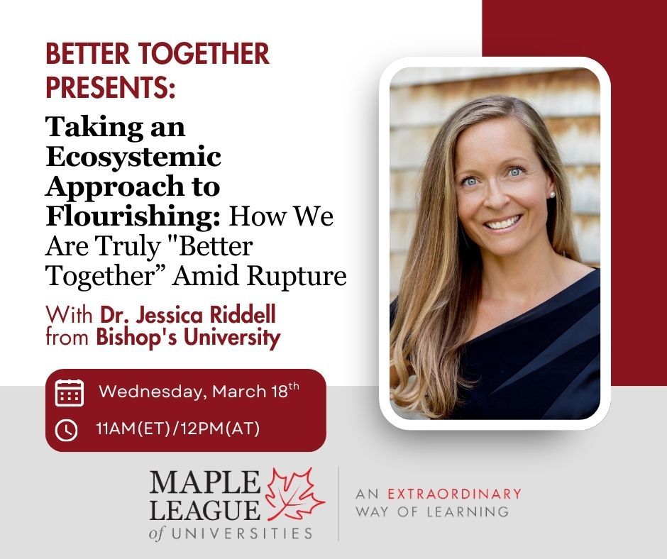 The Maple League Teaching and Learning Committee warmly invites you to our Better Together event: Taking an Ecosystemic Approach to Flourishing: How We Are Truly "Better Together” Amid Rupture with Dr. Jessica Riddell (Bishop’s University).