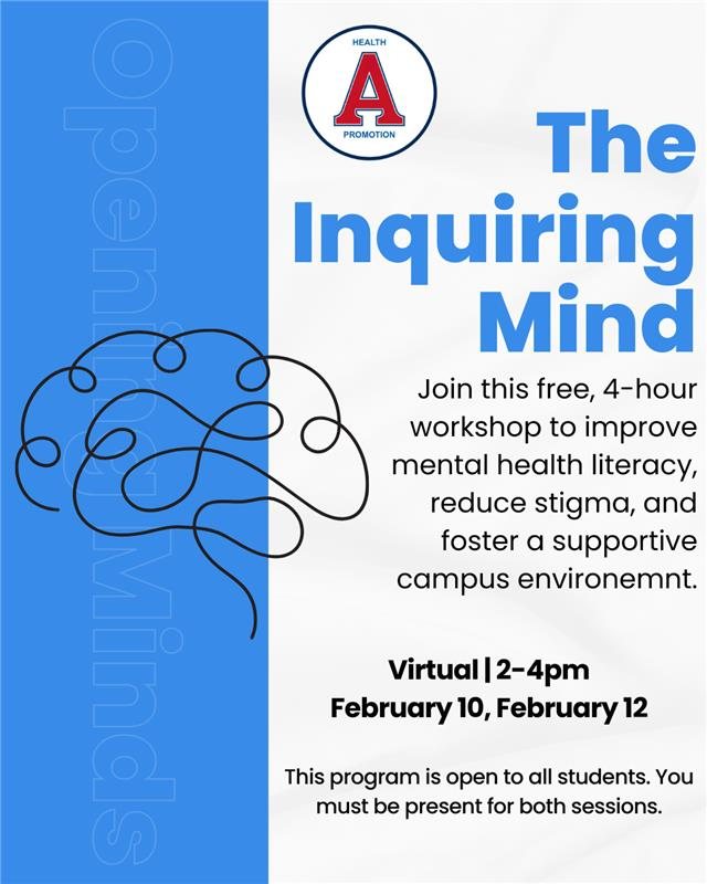Join this free, two part, four hour workshop to improve mental health literacy, reduce stigma, and foster a supportive campus environemnt. Sign-up and attendance to both sessions required.