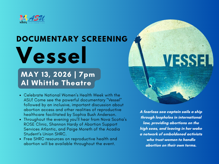 Throughout the evening you’ll hear from Nova Scotia’s ROSE Clinic, Shannon Hardy of Abortion Support Services Atlantic, and Paige Moreth of the Acadia Student's Union SHRC. Free SHRC resources on reproductive health and abortion will be available throughout the event.