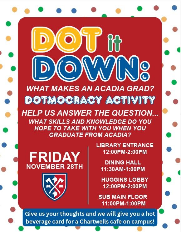Help us answer the question... what skills and knowledge do you hope to take with you when you graduate from Acadia? Visit one of our dotmocracy tables across campus for a few minutes to give us your thoughts.