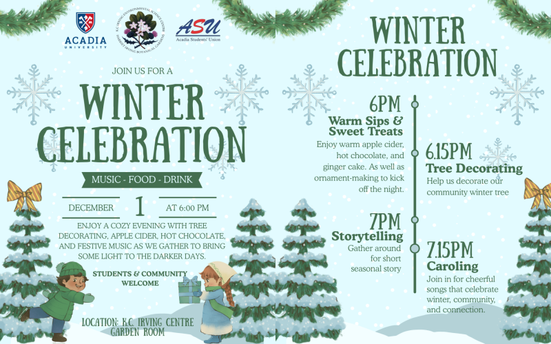 Put on in collaboration between the Acadia Student's Union (ASU), Acadia University & the K.C. Irving Environmental Science Centre, we will create ornaments, decorate the holiday tree, sing, tell stories and gather to bring light to the darker days.