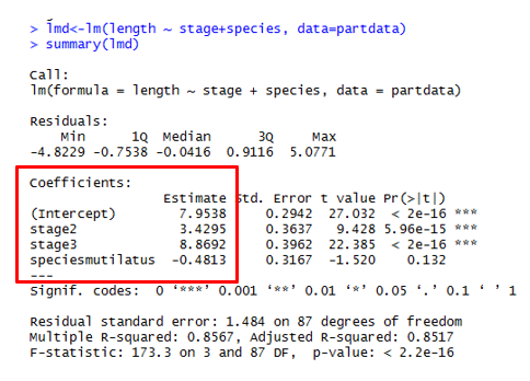 Coefficients MUST BE CALCULATED! Intercept <- Intercept (first value of each factor) i.e. \(stage1 = 7.95\) \(speciesmicans = 7.95\) \(stage2 = 7.95 + 3.43 = 11.38\) \(stage3 = 7.95 + 8.87 = 16.82\) \(speciesmutilatus = 7.95 - 0.48\) \(stage2 = 7.95 - 0.48 + 3.43\) \(stage3 = 7.95 - 0.48 + 8.87\) |