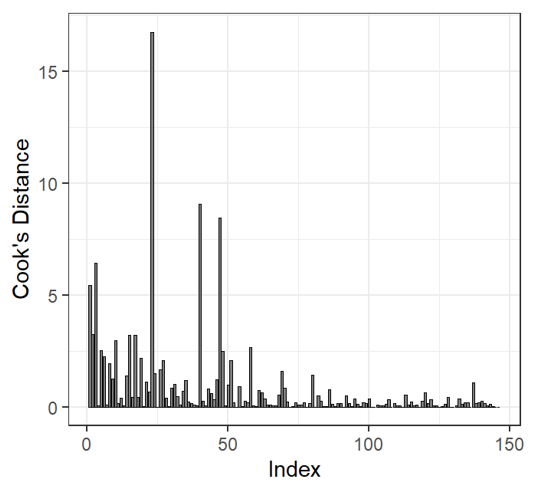 Cooks distance may be used to determine outliers! Cook’s distance values >1 may be influential to the model. But there are over 20 values >1! We cannot exclude all of these observations. Dispersion is still high when we remove largest outlier |