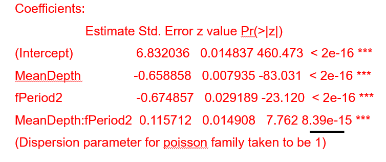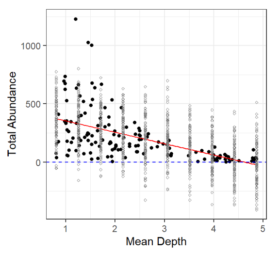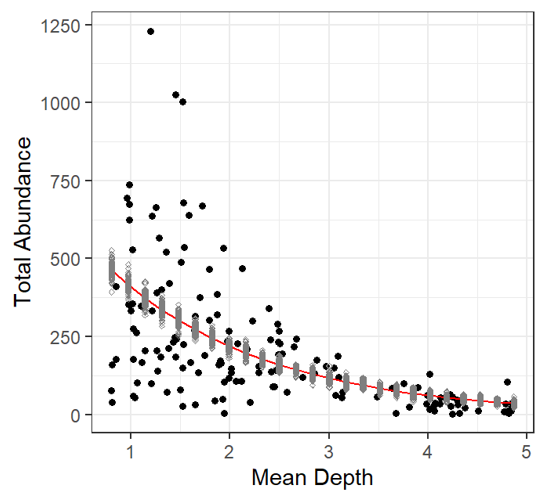 | Poisson Model | \(TotAbun_{i} \sim P(\mu_{i})\) \(E(TotAbun_{i}) = var(TotAbun_{i}) = \mu_{i}\) \(\eta_{i} = \beta_{1} + \beta_{2} * MeanDepth_{i}\) |