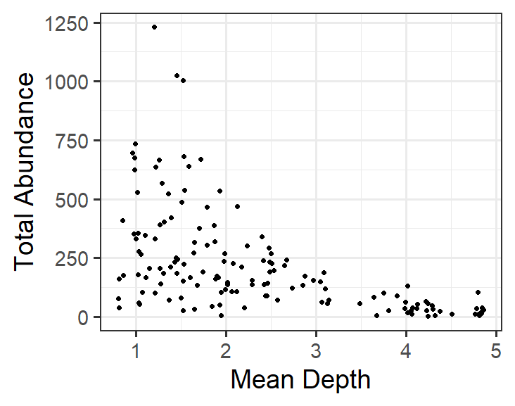 \(TotAbun_{i} = \beta_{1} + \beta_{2} * MeanDepth + \varepsilon_{i}\) \(\varepsilon_{i} \sim N(0, \sigma^{2})\) |