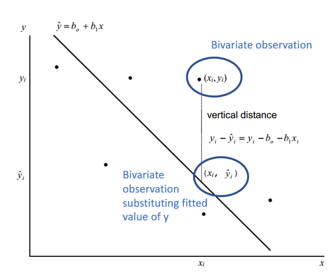 Given a bivariate sample \((x_{i},y_{i}) ... (x_{n},y_{n})\) The vertical drop is given by: \(y_{i} - \hat{y}_{i} = y_{i} - b_{0} - b_{1}x_{i}\) \(\hat{y}_{i} = b_{0} - b_{1}x_{i}\) are the fitted values (and form the line) The least squares line is the line that minimizes: \(\sum(y_{i} - b_{0} - b_{1}x_{i})^{2}\) or more simply \(\sum(y_{i} - \hat{y}_{i})^{2}\) Over all possible choices of \(b_{0}\) and \(b_{1}\) That is, if we randomly chose many \(b_{0}\) and many \(b_{1}\), say 100,000 we may happen upon the exact values However, both \(b_{0}\) and \(b_{1}\) can be calculated! |