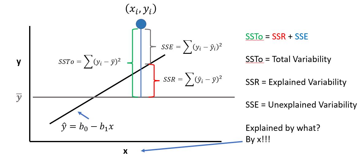 The LSRL is a good fit if the sample points \((x_{i},y_{i})\) along the LSRL defined by \(\hat{y} = b_{0} - B{1}x\) is much better than \(\overline{y}\) (mean value of all \(y_{i}\)) at predicting the observed \(y_{i}\) Or (equivalently) if the total variation in the \(y_{i}\) values is well exxplained by the LSRL! Recall: A residual is also called an error with symbol e. \[e = (y_{i} - \hat{y}_{i})\] Summing all squared errors gives the variation unexplained by the LSRL. We call this error variation the Error of Sum of Squares (SSE) |