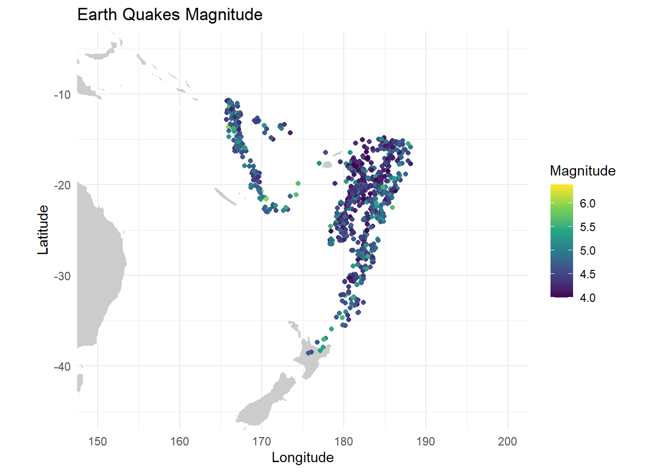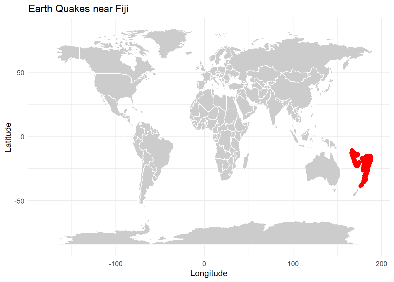 We will now create the base map layer by putting our geographic dataset into the geom_polygon() function and overlay our spatial data (earthquakes near Fiji) with the geom_point() function.