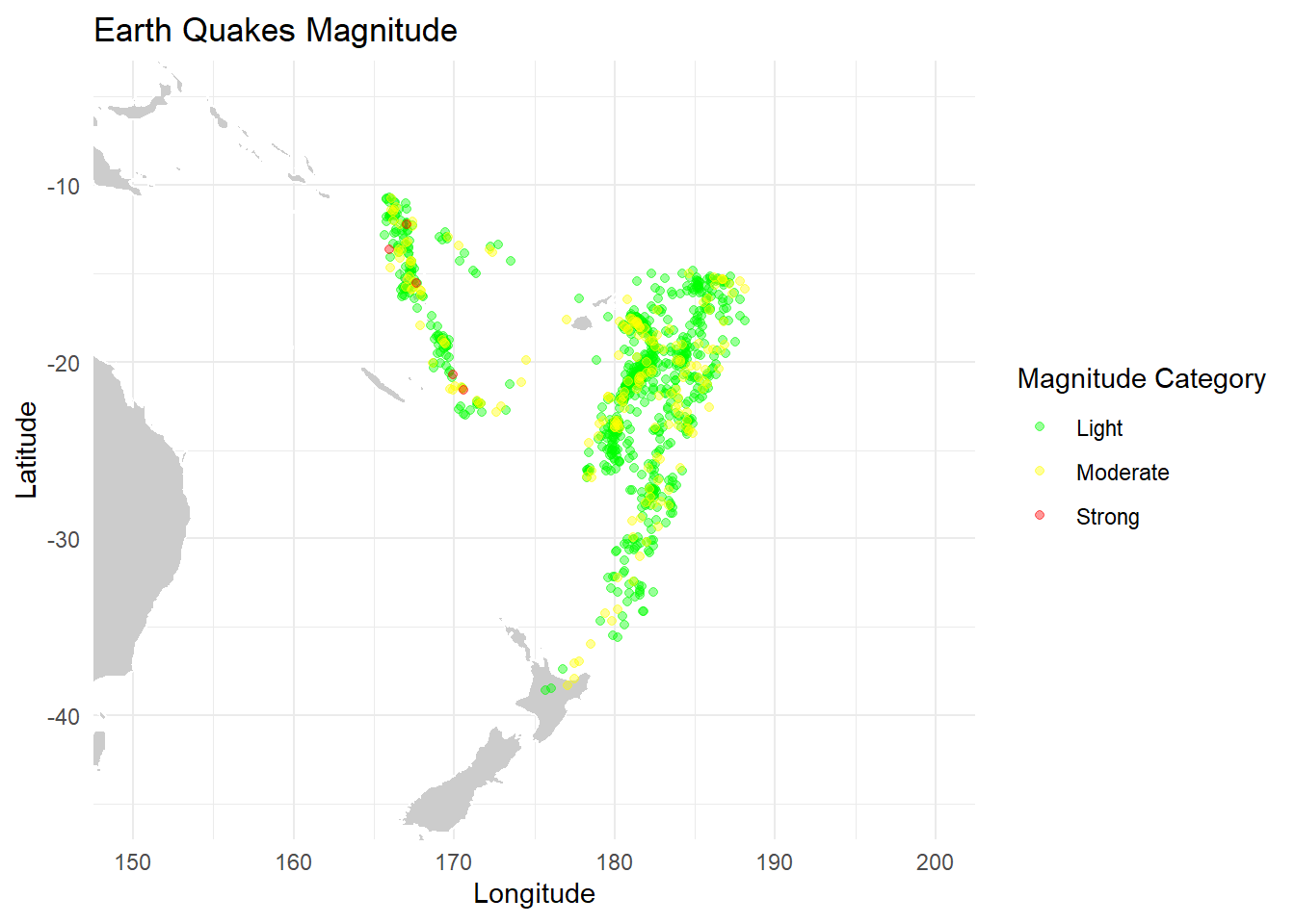 To group data (e.g., earthquakes) by a factor or variable such as mag (magnitude) and visualize it on the map, you can adjust the aes() function within geom_point() to assign colors to different levels of the grouping variable.
