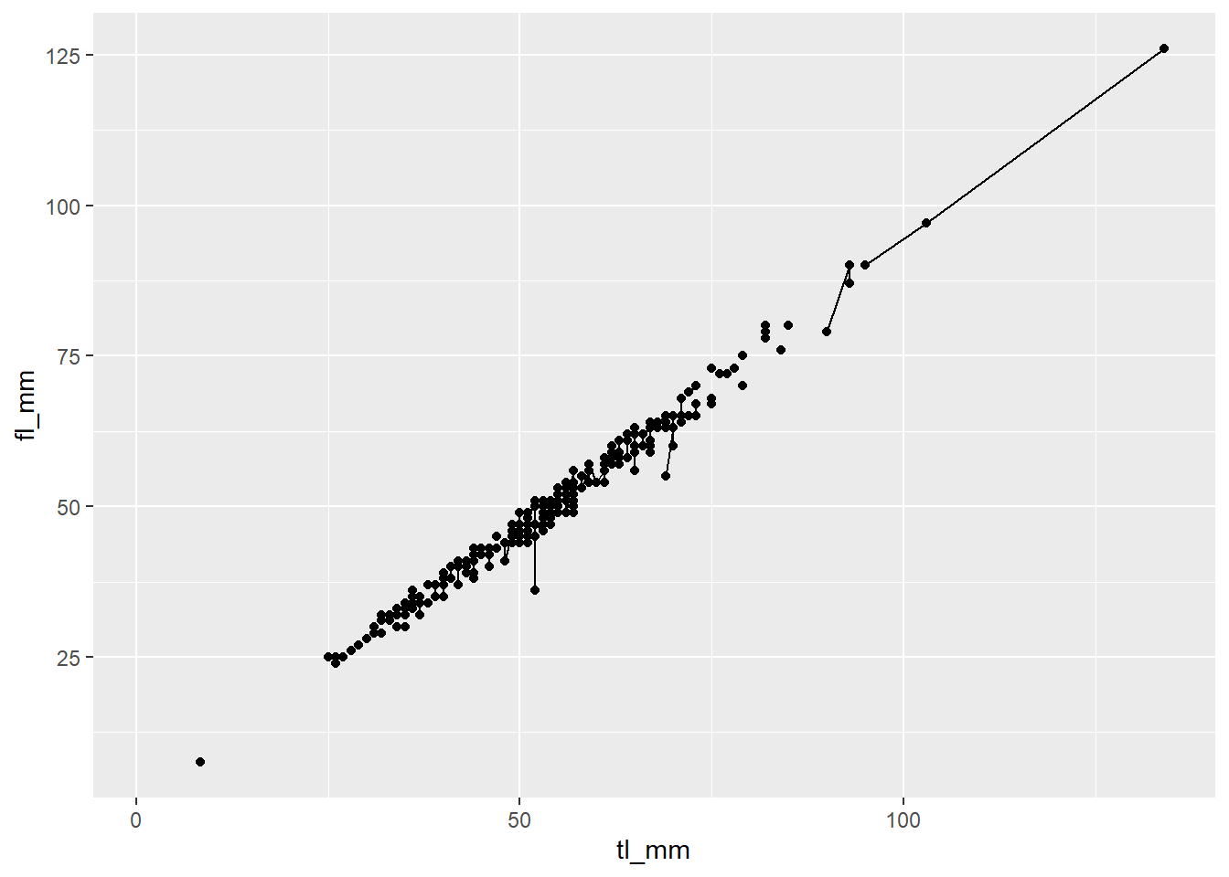 geom_line(mapping = aes(x = tl_mm, y = fl_mm))