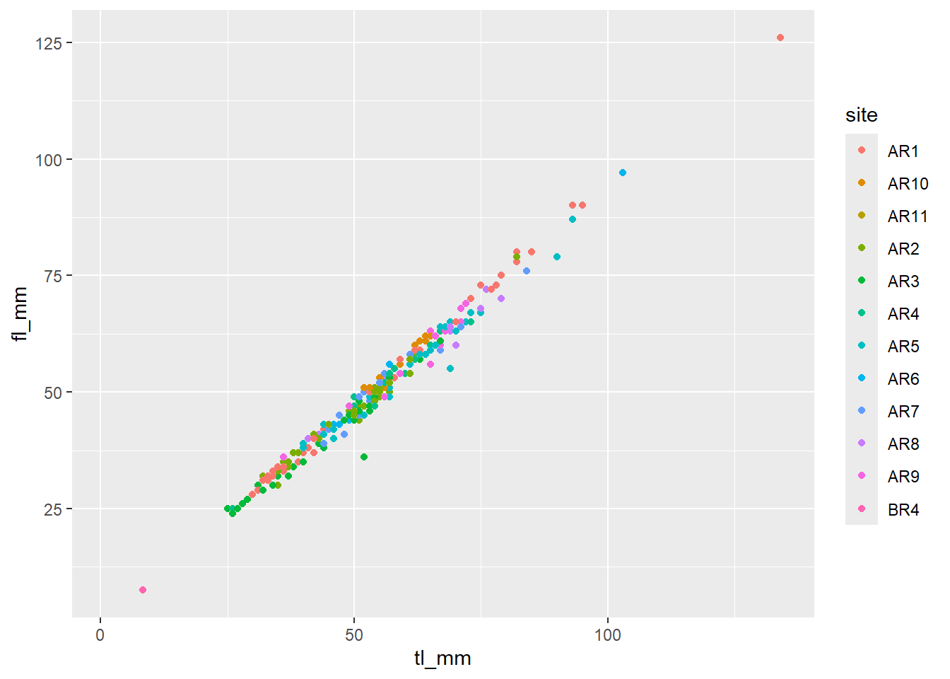 geom_point(mapping = aes(x = tl_mm, y = fl_mm, color = site))