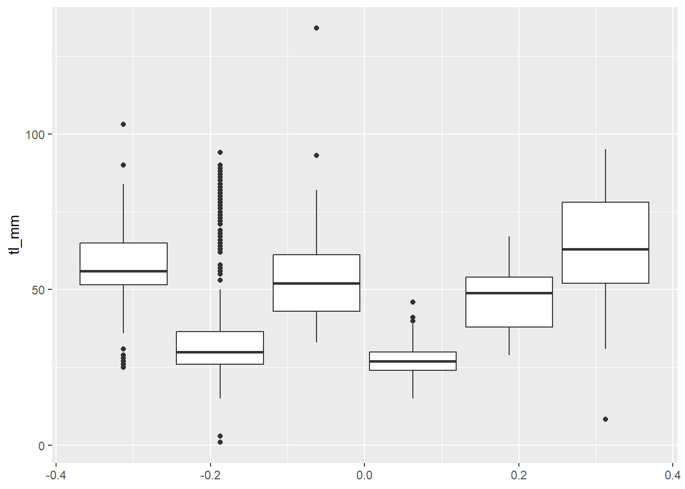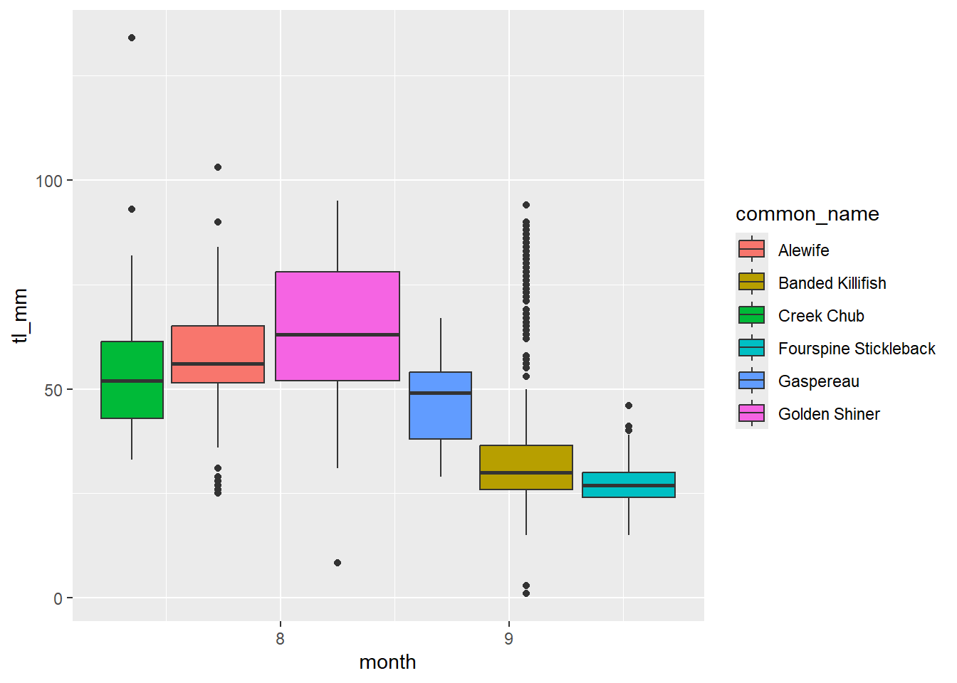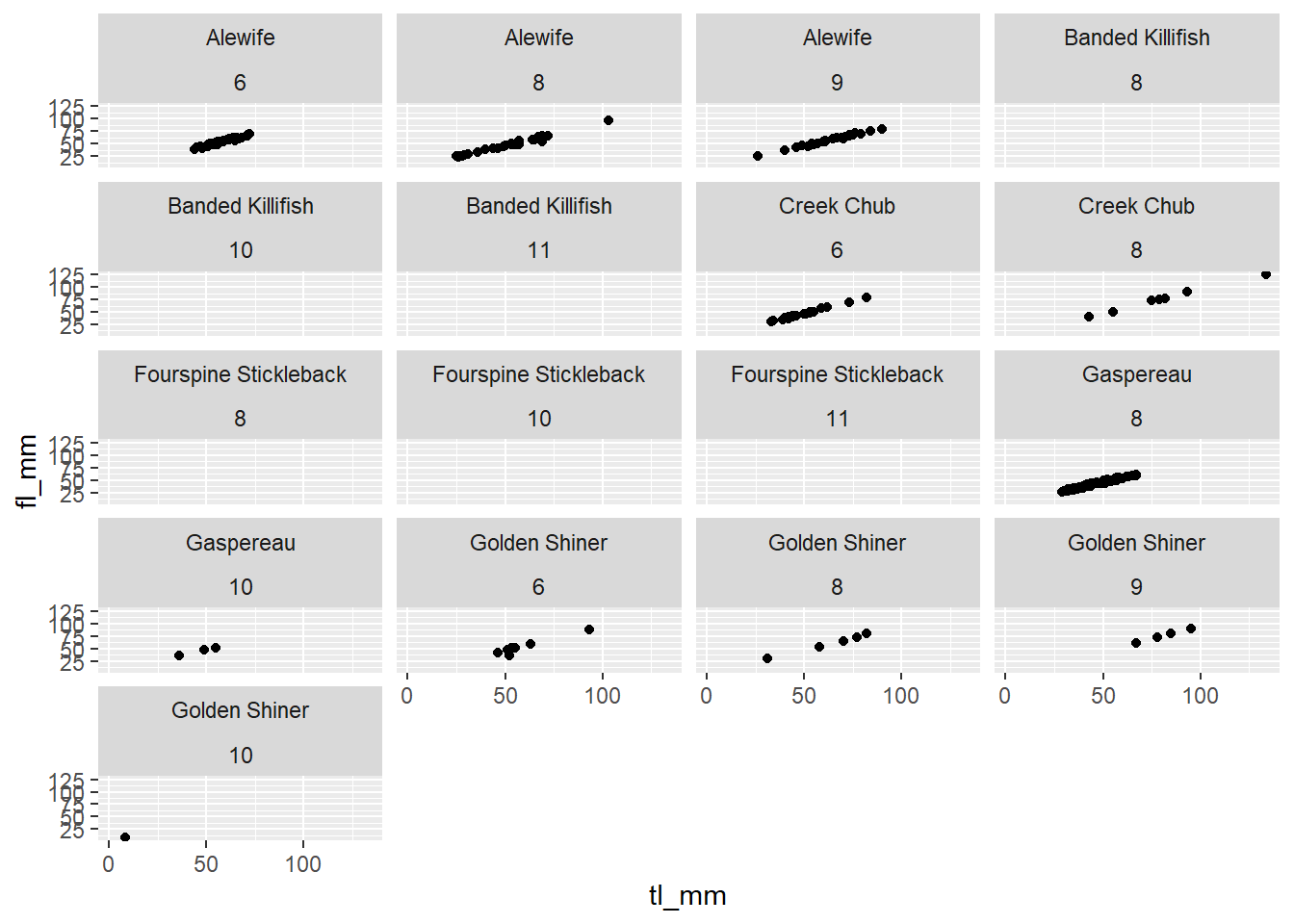 # plot19 <- ggplot(data = mydata, mapping = aes(x = total_length_mm, y = fork_length_mm, colour = factor(site), size = month)) +